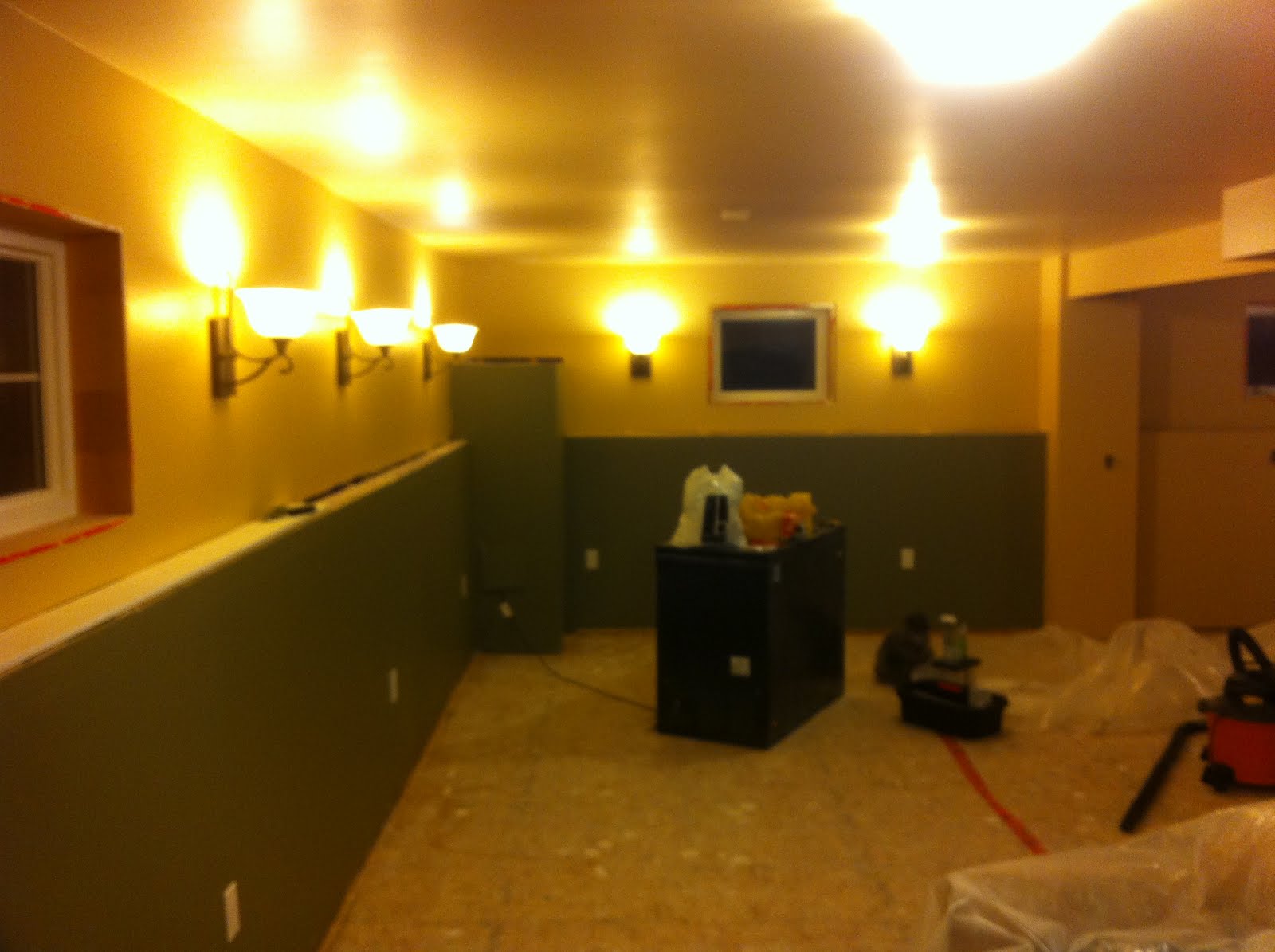 Well the basement is getting there, and this weekend so a lot of spit and polish. We finished the second coat of paint, and there is a little bit of touch up to do, but we will wait until the end to do that. We also finally wired up all the wall sconces. Those have been a long time coming, and they fill the room with light (okay, it might be a bit too much light, but one of the principle goals of the room is a games room, and for that we need light.
